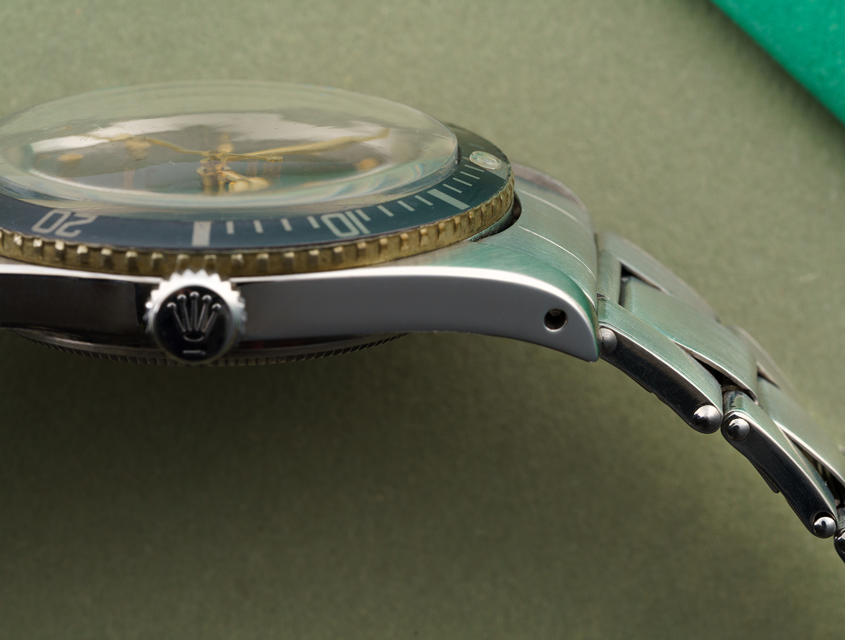 Year stamped “II.58” inside the caseback, this early no crown-guard reference captures the purest expression of the early Submariner design. The black dial is glossy with just a hint of spidering, defined gilt typeface, and the correct “100m = 330ft” depth rating in rich gold. The 6 o'clock radium hour marker glows brighter, an original characteristic indicating no restoration to the dial.