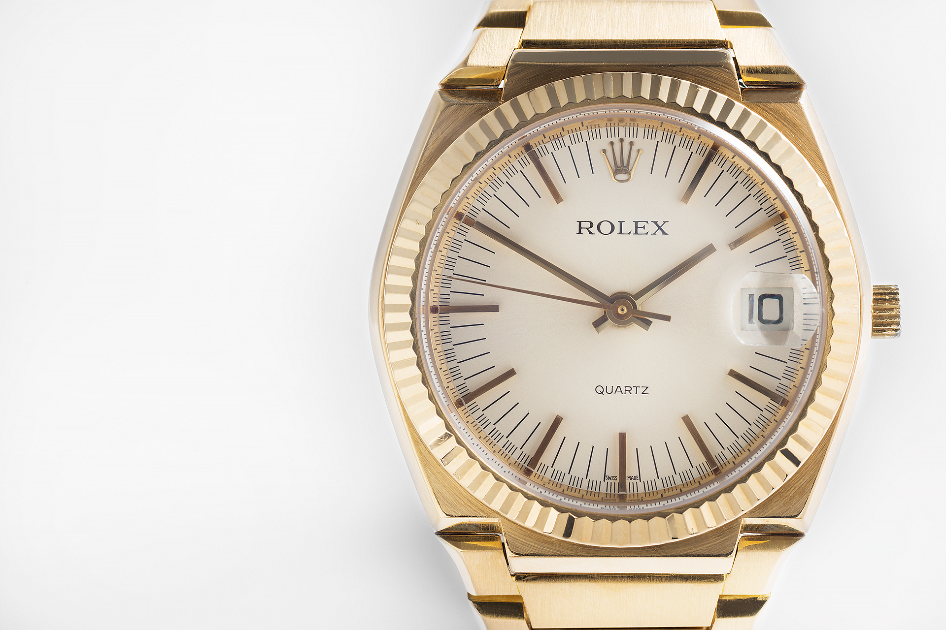 The only official limited edition Rolex ever made public, the ground-breaking 'Beta 21' powered 5100 Oyster Quartz... The unique (numbered edition) 18ct yellow gold case is unlike anything else that ever left the Geneva workshop, and was the very first Rolex ever fitted with a sapphire crystal glass. Only around 750 pieces were produced in 18ct yellow gold and to find one in such crisp (and fully working) condition today is a genuinely rare thing. One of the crispest examples we've ever seen, you know it's going to be good when Rolex and Patek collaborate on a limited edition!