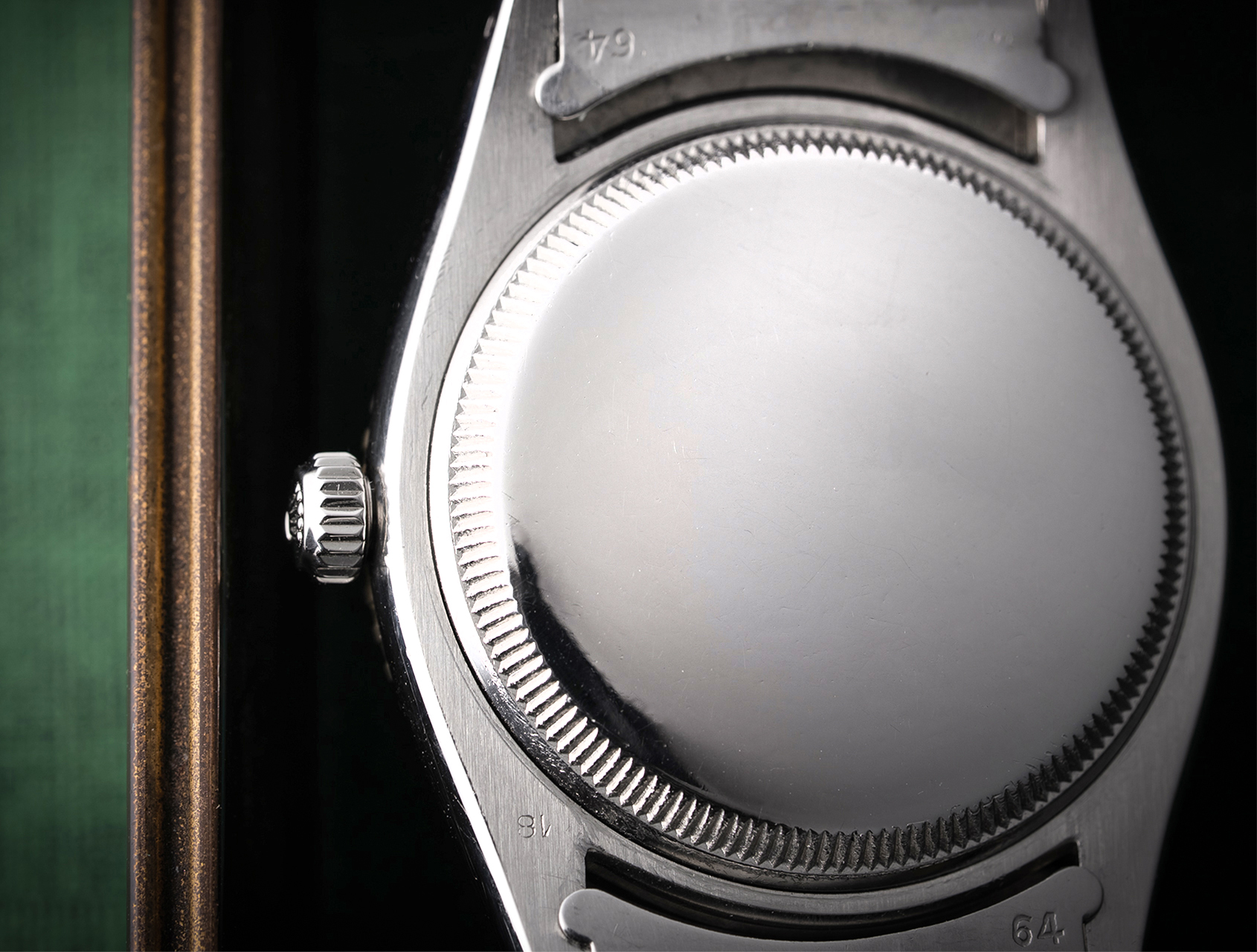 Its original deep green/black aluminium bezel insert (has a definite dark green hue when it catches the light) remains remarkably well preserved, showing the early '50' red triangle configuration unique to first-series Turn-O-Graphs. The 36mm stainless steel Oyster case retains strong proportions and crisp chamfers, housing the self-winding A260 calibre movement Rolex’s first rotor-equipped automatic movement to feature in a sport model. The lug and inner caseback both etched '18' confirming they were assembled together during production at Rolex. Fitted to the early riveted Oyster bracelet.