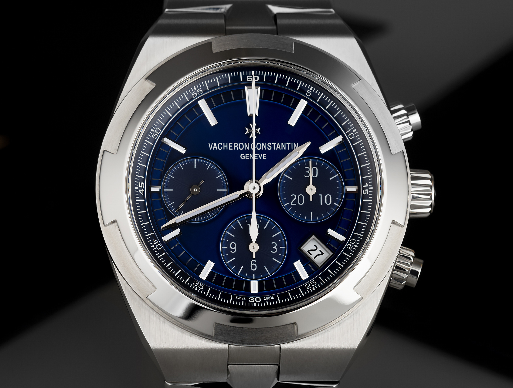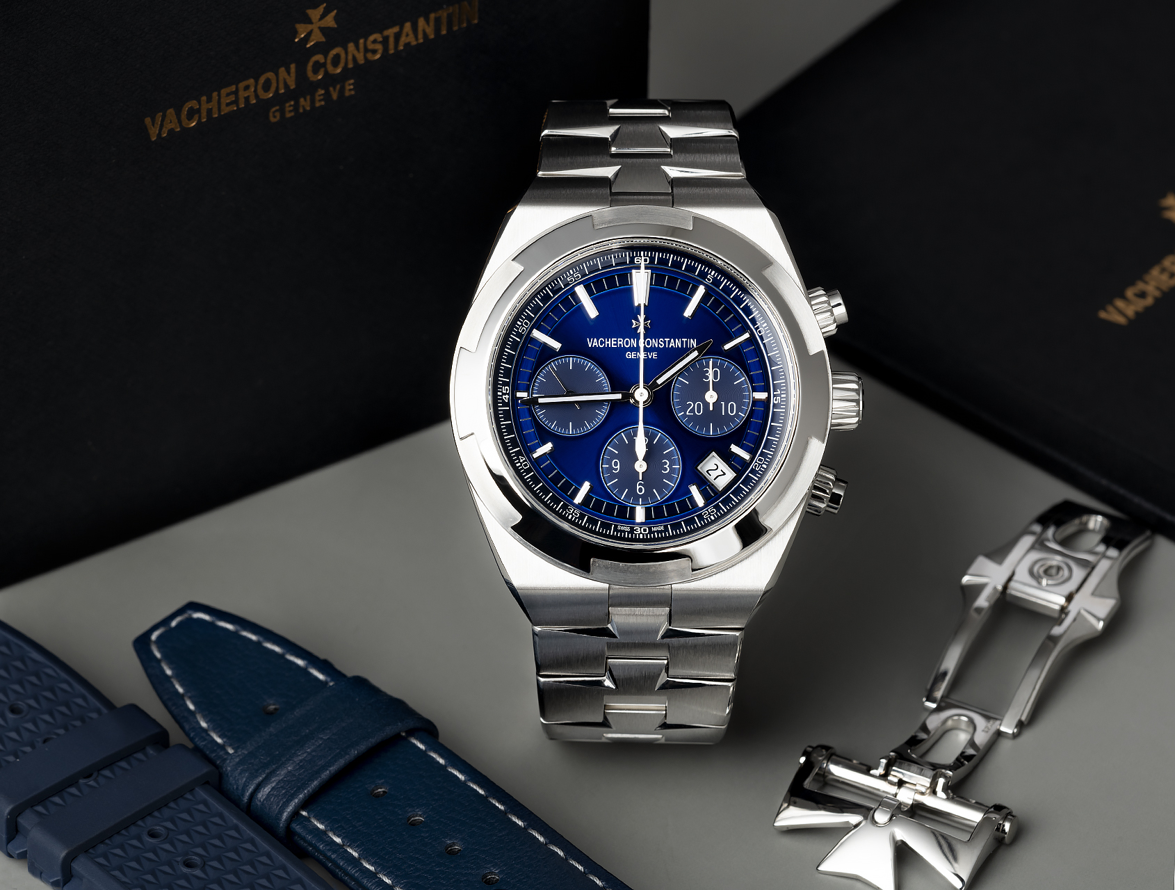 The most sought-after model, from one of the worlds most respected watch-houses; this is the 42.5mm Vacheron Constantin Overseas Chronograph, with gorgeous bright blue dial. Thanks to its hidden extendable clasp (just pull to extend both sides), and interchangeable straps, this is one of the most versatile luxury sport watches in production. Vacheron Constantin self-winding chronograph calibre 5200, waterproof to 150m and presented with its special VC box, Vacheron international warranty card dated Jan 2023, two additional blue straps (rubber and calf leather), and the steel Vacheron deployant clasp.